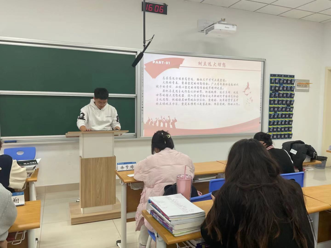 2023年11月21日,在金牛湖园区尚学楼S425教室,2+2国际本科班班长毛唯轩同学讲授了题为“挺膺担当!以奋斗姿态激扬青春的主题团课。辅导员、班主任和全班同学参加了本次团课活动。