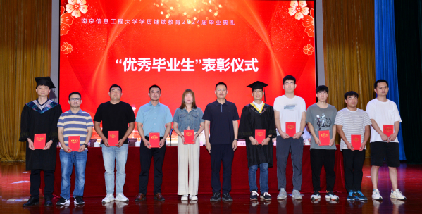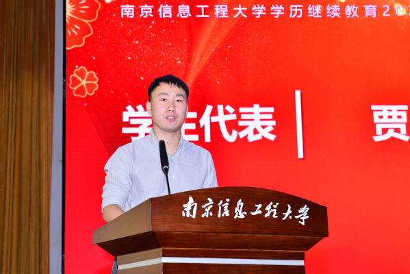 毕业生代表贾坤发言,他用“成长、感激”两个关键词生动地诠释了在南信大两年半实现“知识更新、学历提升”的心路历程。他呼吁全体毕业生,将母校的谆谆教诲镌刻于心,秉持终身学习理念,以实际行动回馈社会,为母校添彩。