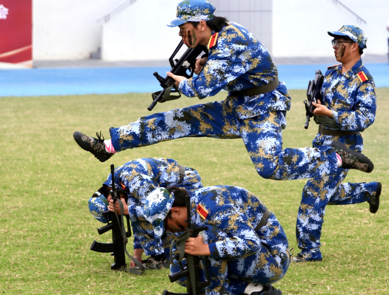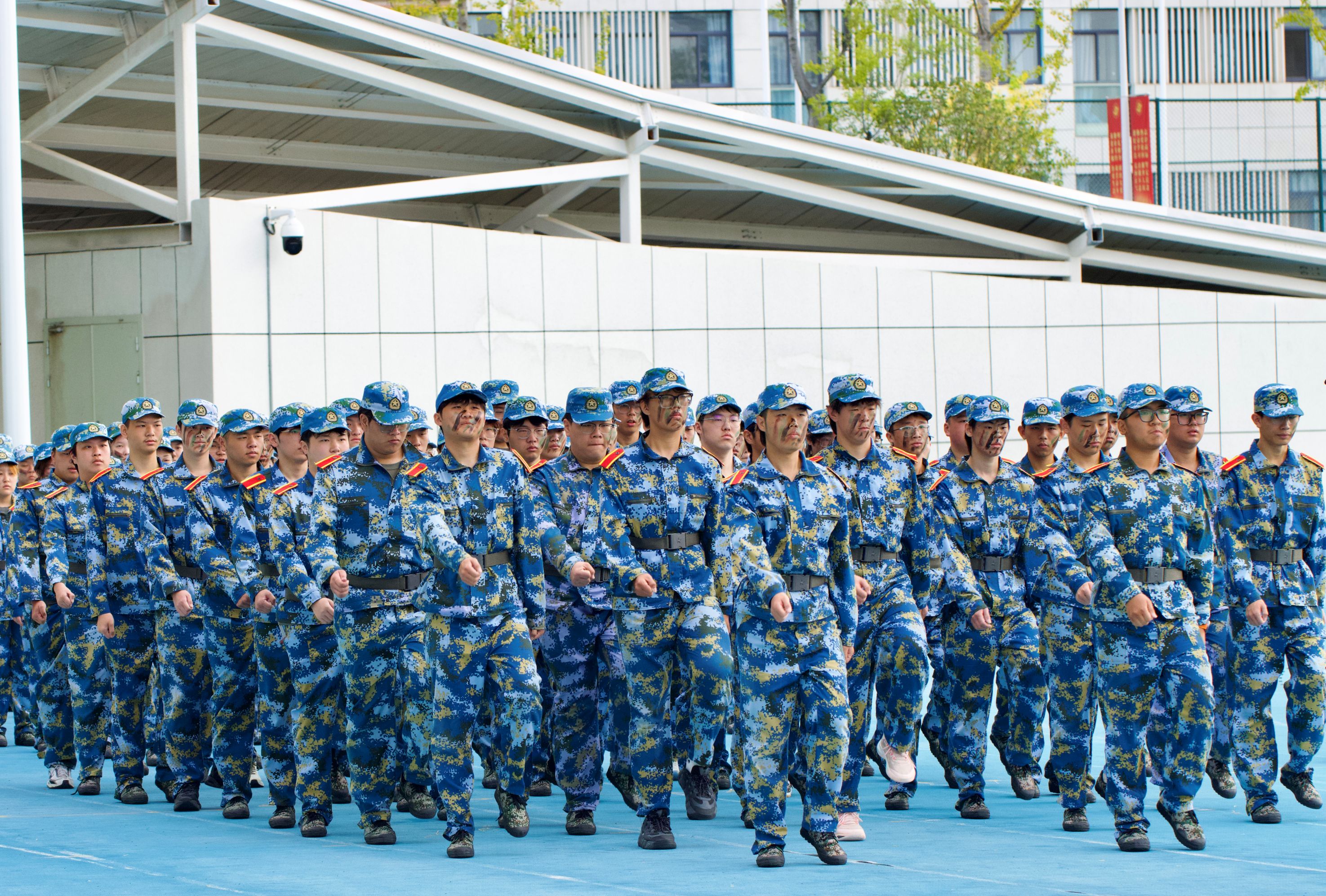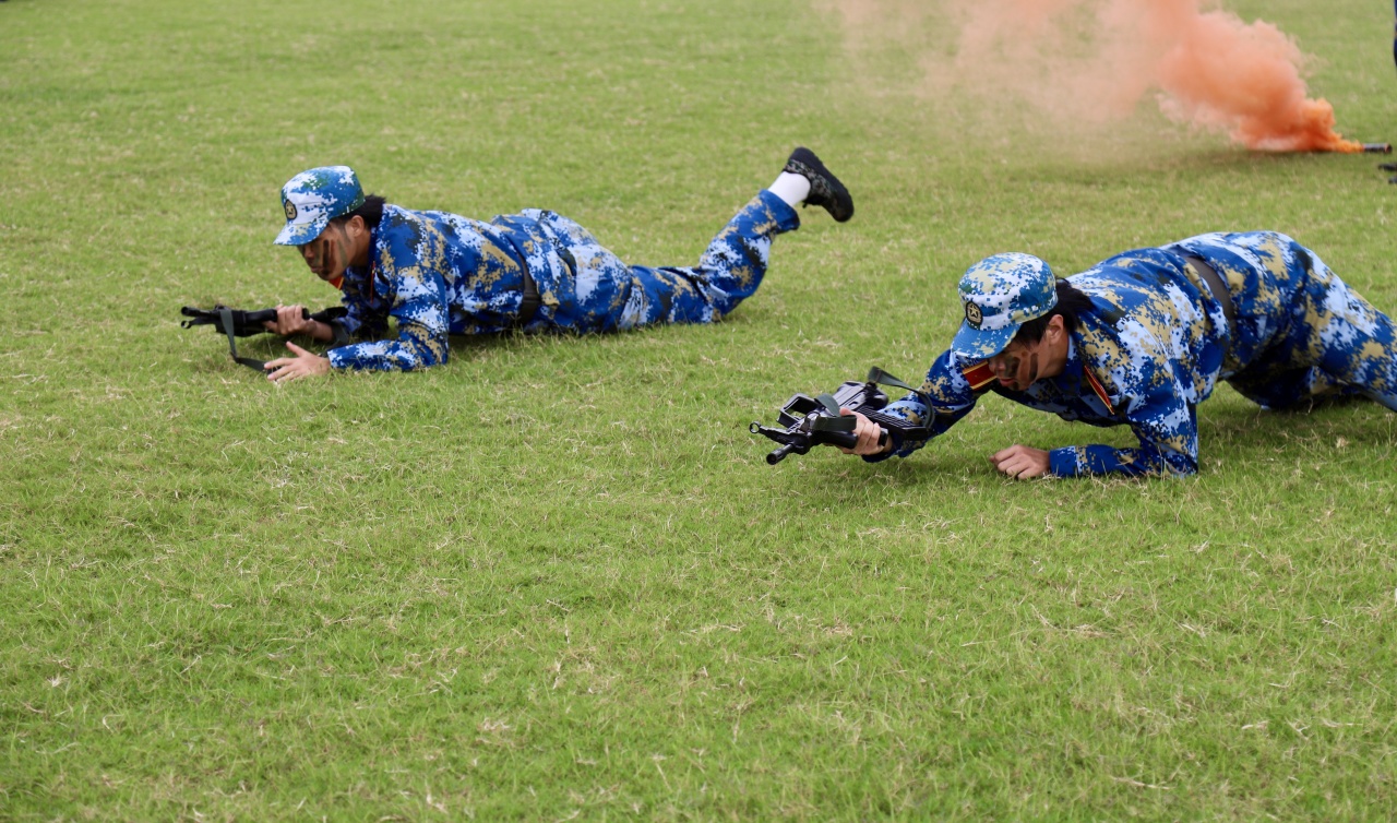 随着白光志副部长下达指令,军训成果汇报正式开启。分列式方阵依次走过主席台,步伐铿锵、摆臂统一,每一步都彰显着十天训练的扎实成果;战术展示环节,匕首操利落干脆,刺杀操喊声震天,弓步冲拳、转身格挡动作整齐有力,新生们用从生疏到熟练的蜕变,赢得现场阵阵掌声。