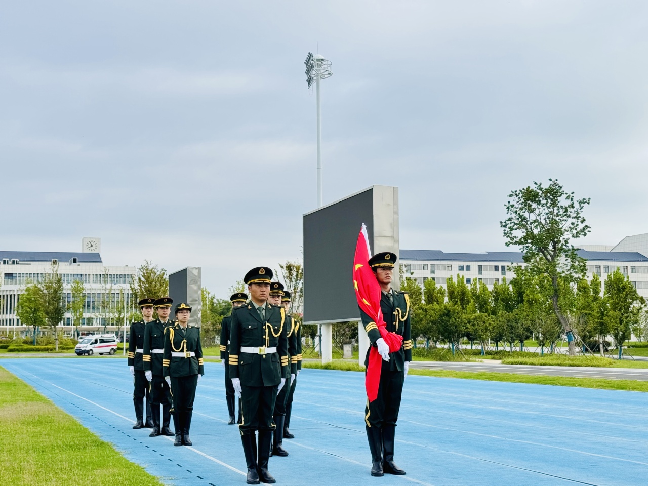 “请全体起立,奏唱中华人民共和国国歌!”指令下达,全场肃立。国旗护卫队迈着整齐正步护送五星红旗至旗杆,激昂的国歌响起,五星红旗冉冉升空。新生昂首仰望,爱国情怀与使命感在心中激荡。国歌落定,营旗入场,新生肃立致敬,尽显对军训精神的尊崇。