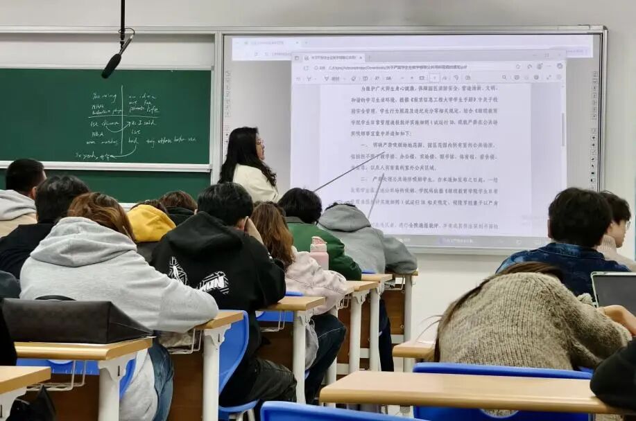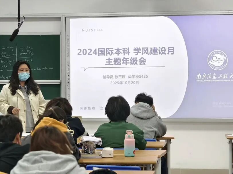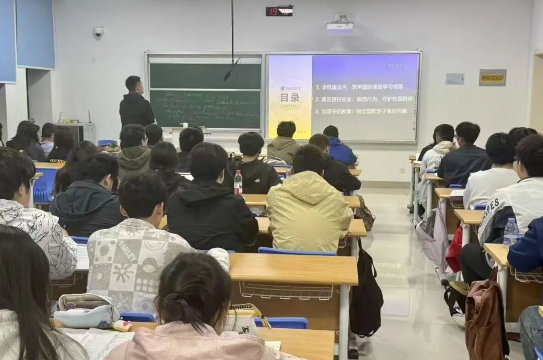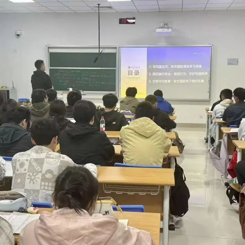 24 级国际本科召开年级会,由辅导员徐玉婷主持,聚焦学风建设月关键任务部署。一是以 “勤” 为先,推进学风建设。要求同学们认真对待每一堂课、每一次考试,全力备战语言考试与留学申请;二是以 “安” 为基,强化园区管理。解读骑行安全与宿舍安全规定,明确安全监督责任,组织签署《安全承诺书》;三是以 “礼” 立身规范行为,强调自觉遵守文明准则,严禁公共场合吸烟与使用违章电器,共同营造和谐校园环境。